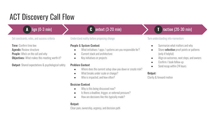 This chapter shows you how to prepare for, run, and debrief a discovery call with precision: what you need to walk away with and how to avoid the most common mistakes technical founders make. Weak discovery is almost always the root cause of deals that stall or fall apart later.