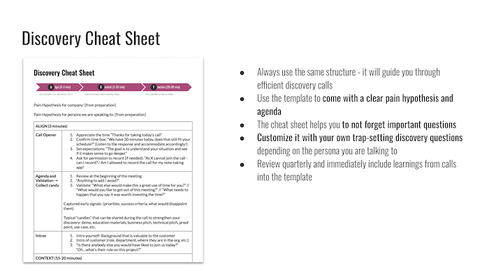 The Discovery Cheat Sheet is a practical template that helps you show up prepared, ask the right questions in the right order, and capture exactly what you need without relying on memory or improvisation. It's designed to be used consistently across all deals, so discovery becomes a process, not a performance.