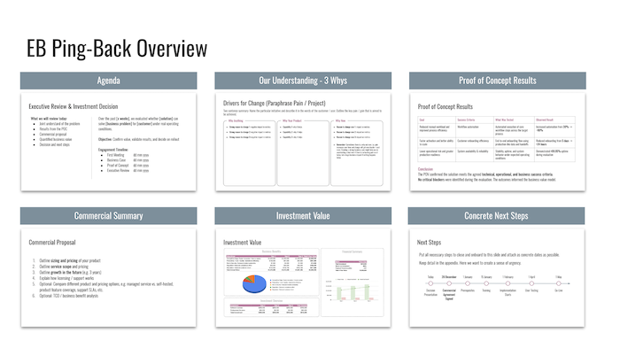 The EB Ping-Back is the executive review you run after the business case and POV are complete. You present the evaluation results, confirm the commercial structure, and move to a formal proposal; this chapter helps you run that meeting with the confidence and clarity that earns a yes.