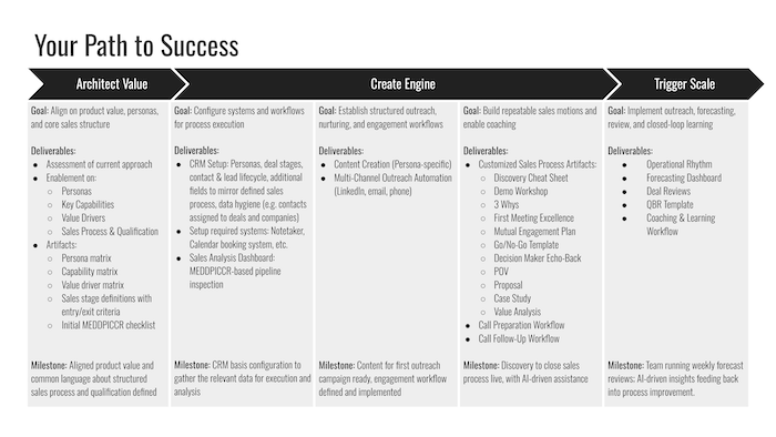 You raised because something worked. Now investors expect a scalable motion. Reps close differently. Qualification is inconsistent. CRM is noisy. Hiring a VP Sales will not fix this. A structured value architecture and sales process will.