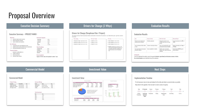 Generated to support every stage of the sales cycle, each grounded in the value architecture built during the engagement.