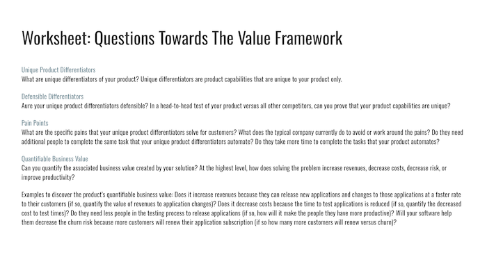 Through a guided set of questions, you'll work through your unique product differentiators, defensible competitive advantages, and the specific pain points they address. It's designed to be used as a working session, either solo or with your team, to ground your value framework in real product strengths.